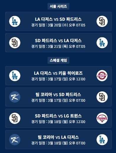 오는 3월 17일부터 21일까지 LA다저스와 SD파드리스 두팀이 고척돔에서 경기를 펼칩니다. 고척돔을 홈팀으로 쓰고있는 키움히어로즈와 LG트윈스와 겨루는 스페셜게임 4경기, 그리고 서로 맞붙는 두경기 해서 총 6경기를 치룹니다.